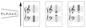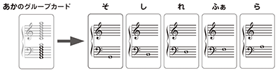 グループカードを左に置き、そのグループカードに含まれている音のおんぷカードを右に並べ、「そしれふぁらのそ」「そしれふぁらのし」と声に出して読みましょう。