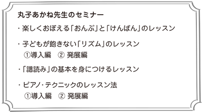 『ピアノのほん』シリーズを対象とした「ピアノ・テクニックのレッスン法」というセミナーを行っております。「指導のポイント」の解説をはじめ、すてきな音をならすための手首の使い方や子どもたちへの声かけなどを、あかね先生の実演によって学ぶことができる充実したセミナーです。お近くの楽器店で開催されるようでしたら、ぜひご参加ください!